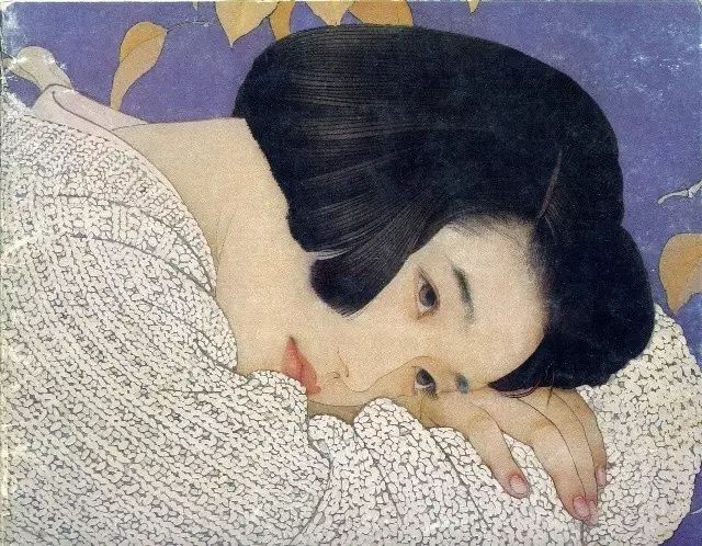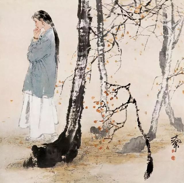 作品虽表现的是秋天的意境,却一点也不显萧瑟,相反,整幅画面色彩明快,用墨以黄、白、蓝色为主色调,墨色显得层次分明,干净利落,让人不禁会去想,在这美丽的地方,这样干净美好的少女,到底在思考什么呢?