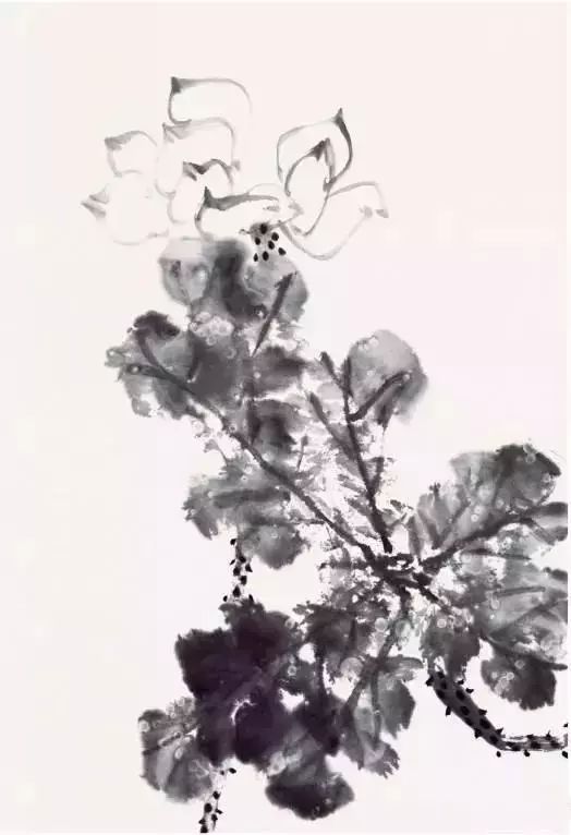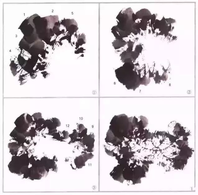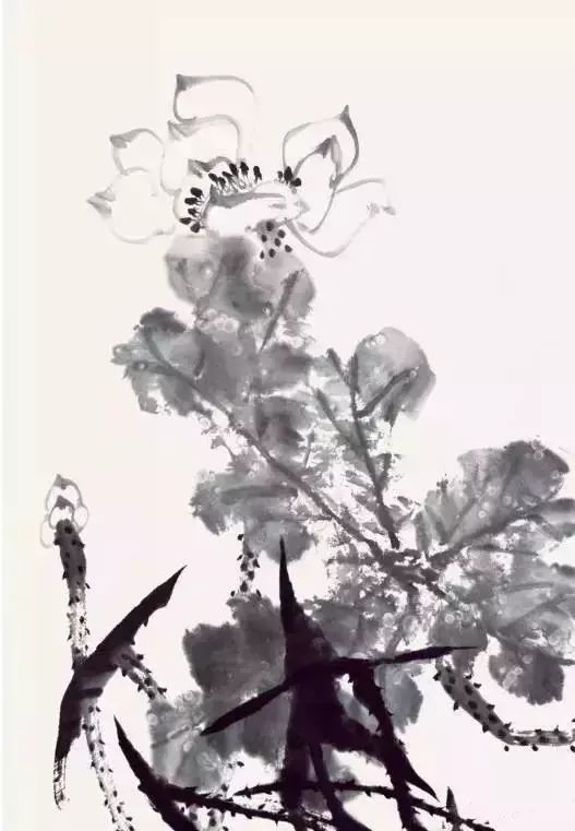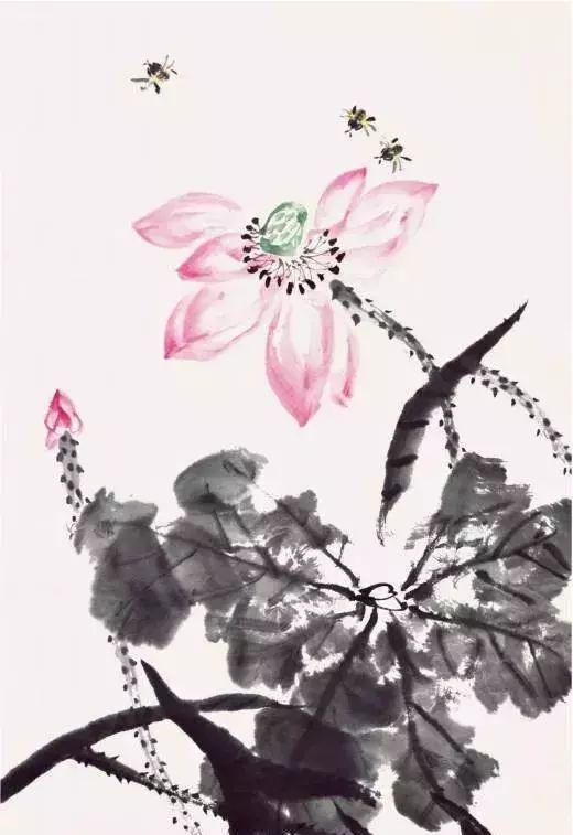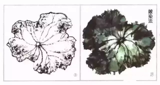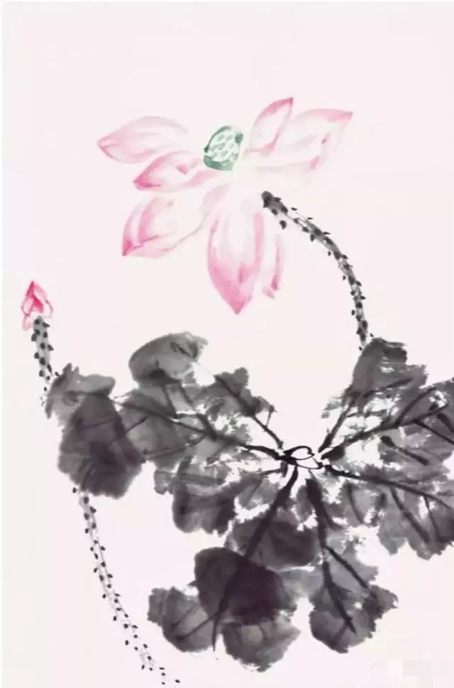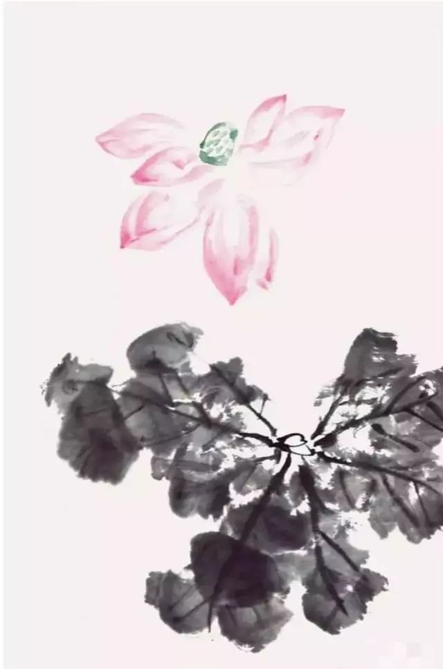 荷叶可用大羊毫笔,先蘸淡墨,笔端蘸浓墨,侧锋用笔,由外向里,或由里向外依次展开,注意笔触的大小和边缘线的起伏及外实内虚的变化。